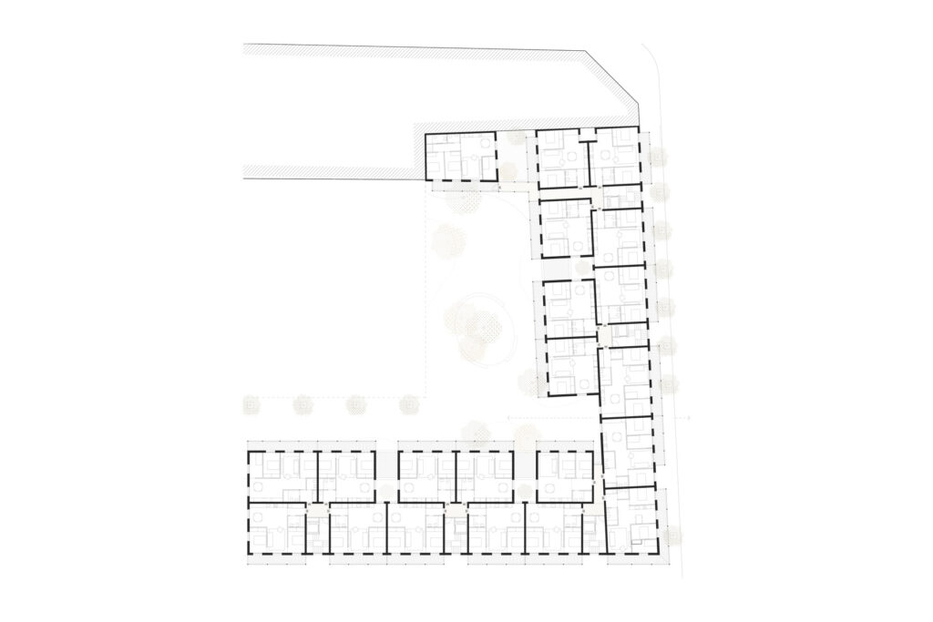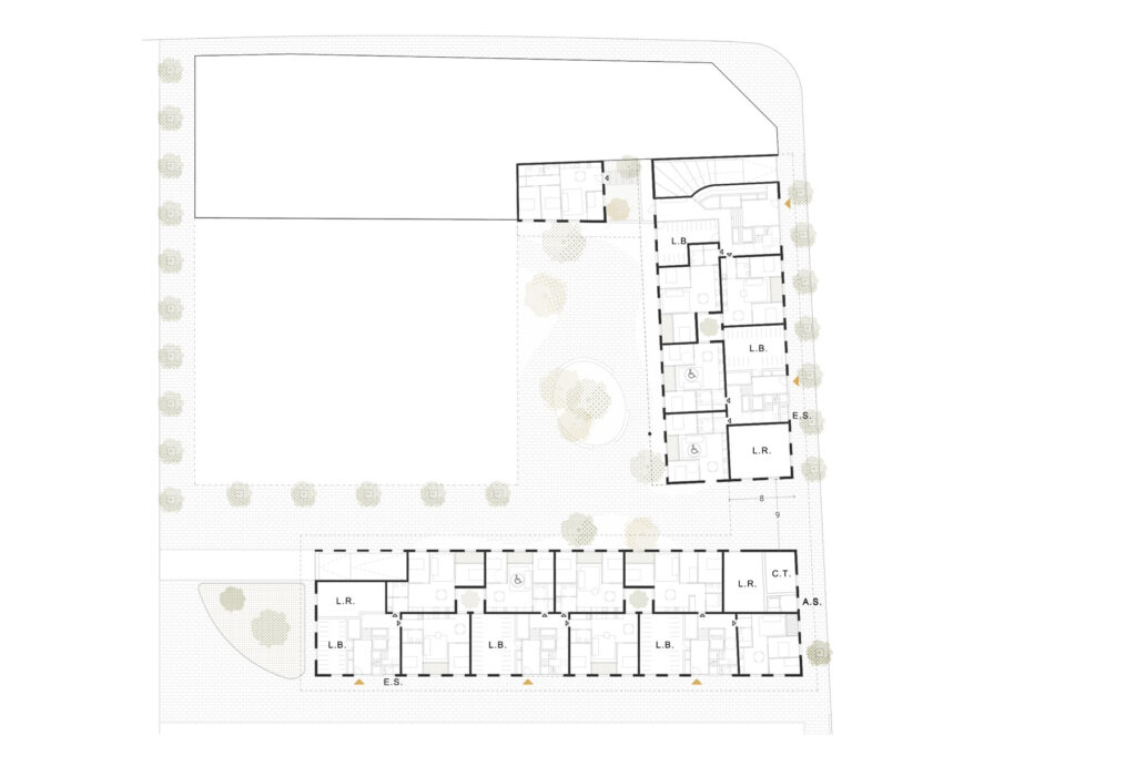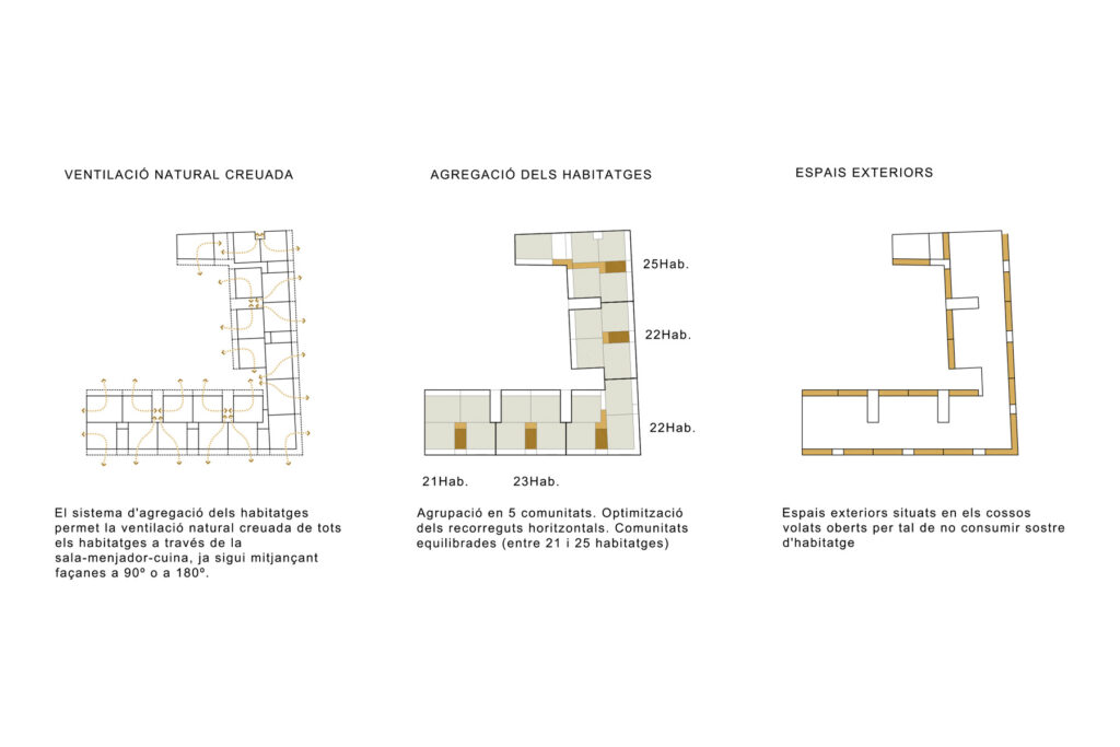 Tenint en compte la jerarquia dels espais s’han situat els accessos i mantingut l’alineació contínua a la façana de carrer i s’han disposat les reculades a l’interior d’illa. S’ordenen les agrupacions capiculant a un costat del bloc els patis oberts a façana i a l’altre els nuclis d’escales, tots ells són de la mateixa dimensió per permetre una agregació de mòduls d’habitatge d’igual mida.