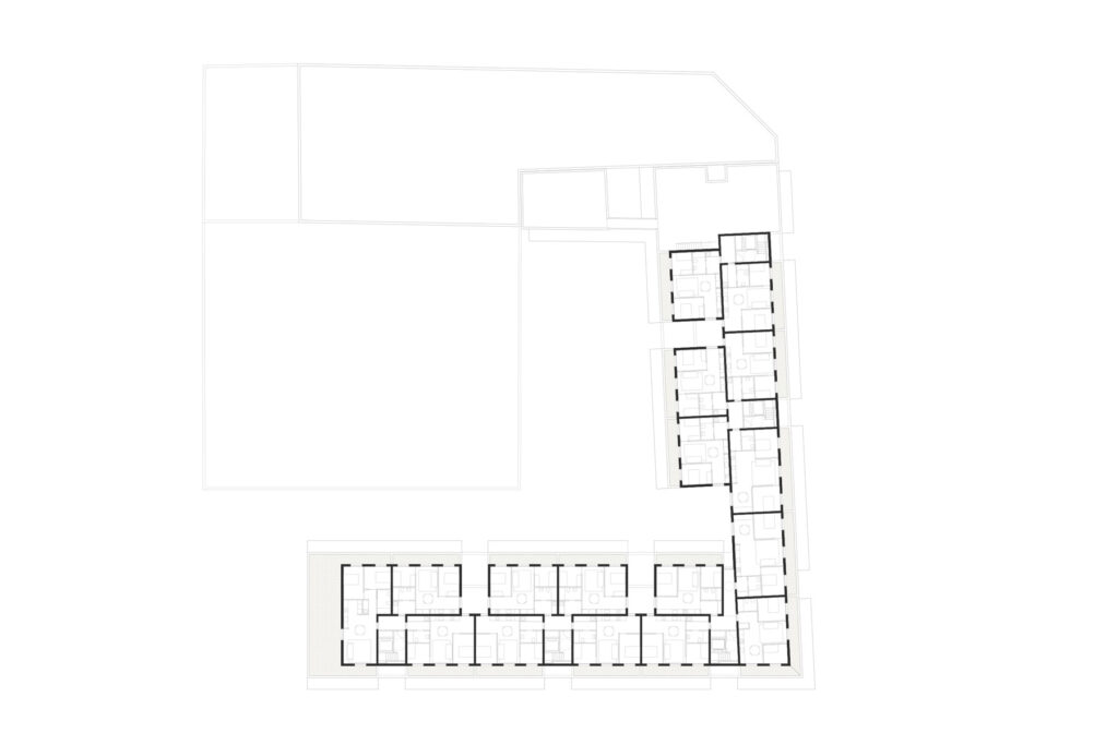 L’estratègia seguida per organitzar habitatges petits en una fondària edificable de 16 m ha estat a aprofitar el marge de maniobra que permetia el planejament en la definició de la volumetria, per disposar una organització de 4 habitatges per replà amb pati obert a façana. S’ha buidat l’edifici en cinc punts per introduir llum i ventilació a l’interior.