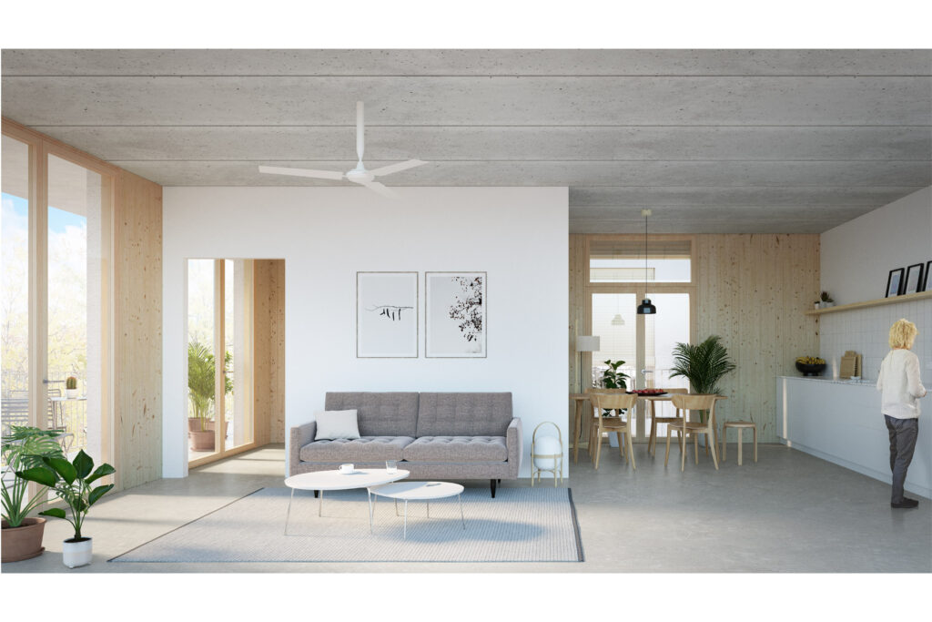 El tipus principal serà un habitatge per a quatre persones, sobre aquest es fan variacions d’habitatges per tres i cinc persones, aprofitant les situacions especials de testers, cantonades, etc. El mòdul tipus, un habitatge de proporcions compactes, tindrà una dimensió mesurada a eixos de 8,75 m d’ample per 7,75 m de fondària. Es maximitza l’espai sala-menjador-cuina, que sempre disposa de dues façanes siguin a 90° o façanes oposades, cosa que permet la ventilació creuada. La cuina, per tant, s’integra en l’espai de dia, fent-la inclusiva i evitant rols de gènere, al seu costat se situa la zona de rentat. Les habitacions, totes equivalents i la sala es disposen sempre en continuïtat amb l’àmplia terrassa, que té la mateixa longitud que l’habitatge (8,5 m).