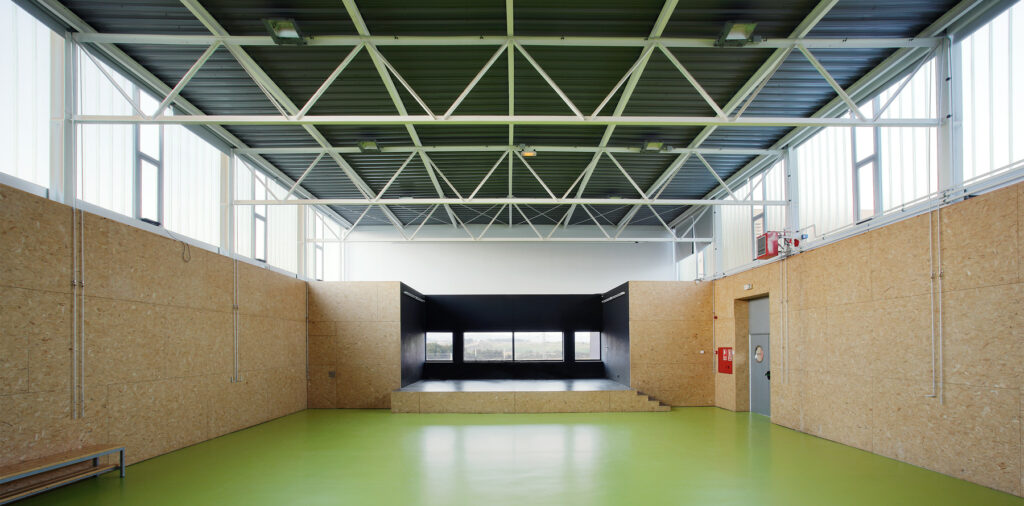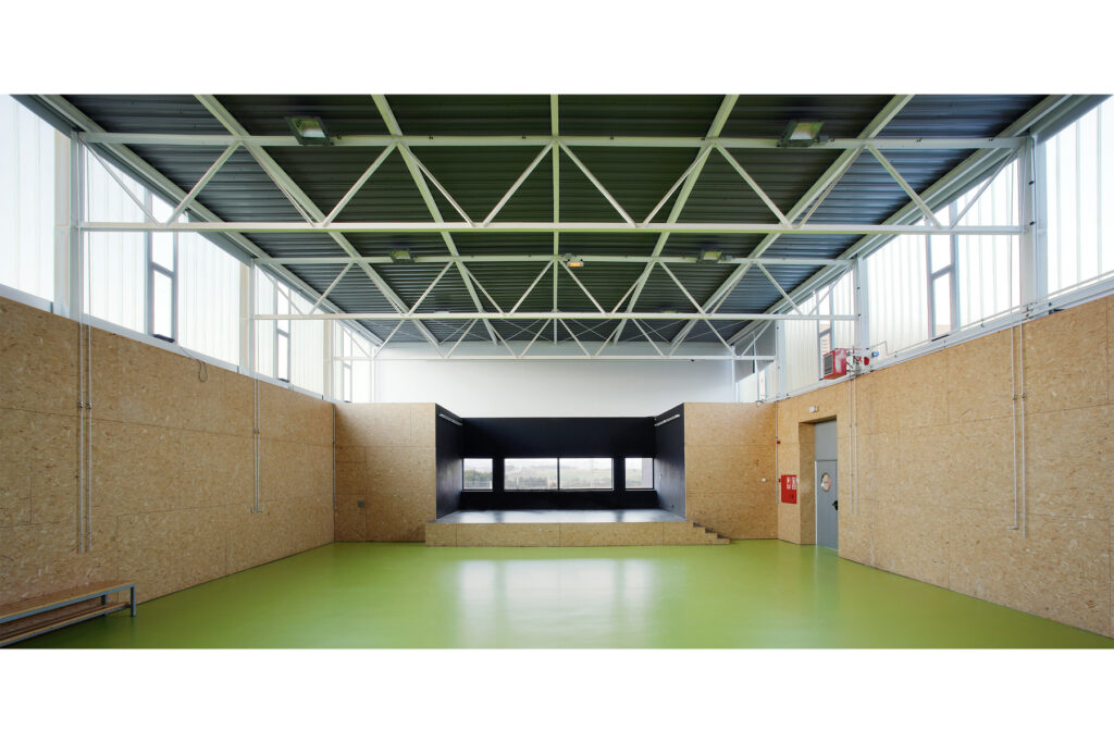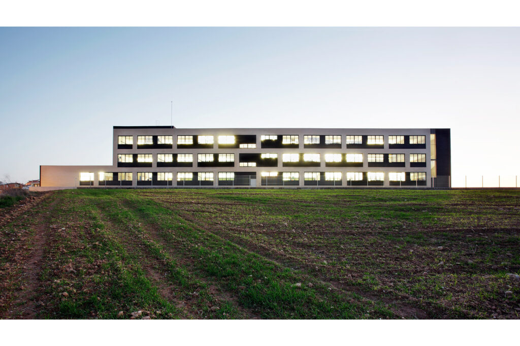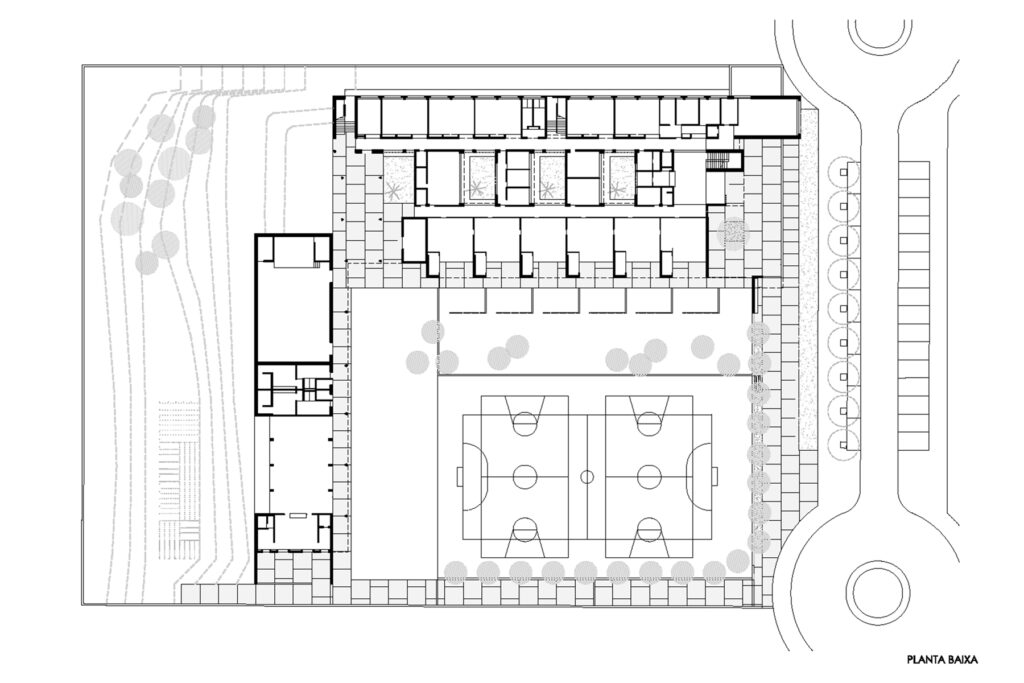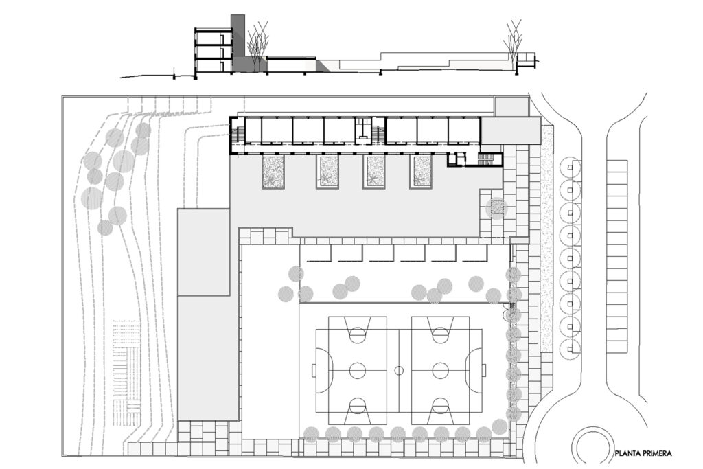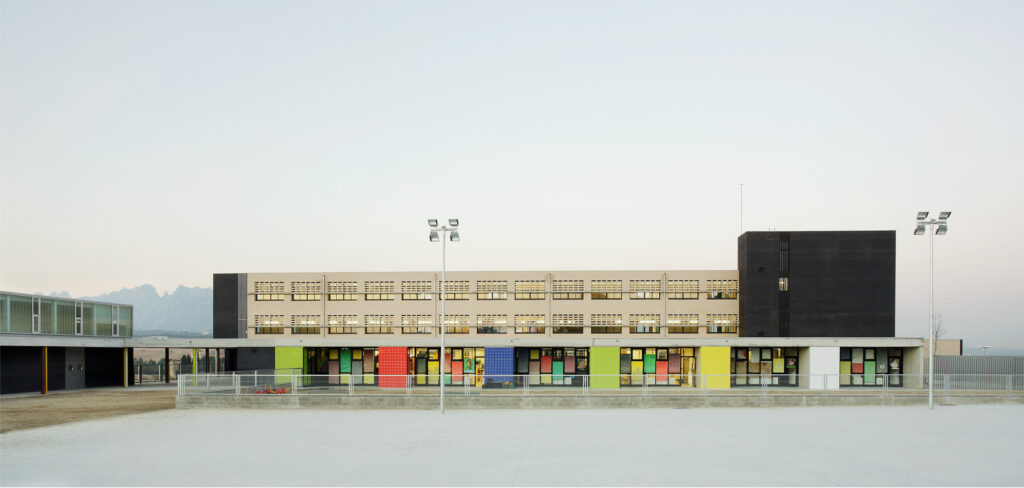 La presència inicial d’uns mòduls prefabricats al solar determina la implantació de l’edificació en la part que resta lliure del solar. Per tant, a diferència d’altres projectes que compten amb un ampli pati entre infantil i primària, com el CEIP a Sant Cugat, aquí s’ha de proposar una organització més compacta, substituint l’espai lliure central del jardí interior per una successió ordenada de patis que il·luminen i amplien la percepció visual dels recorreguts en planta baixa i escenifiquen les relacions de les dues edats escolars.