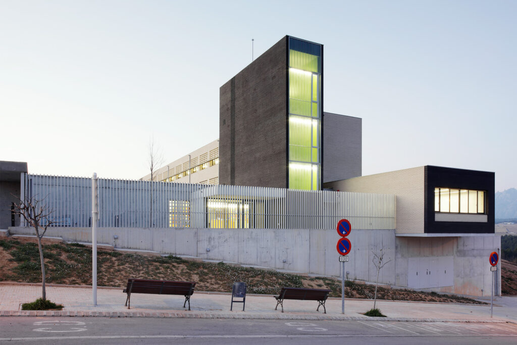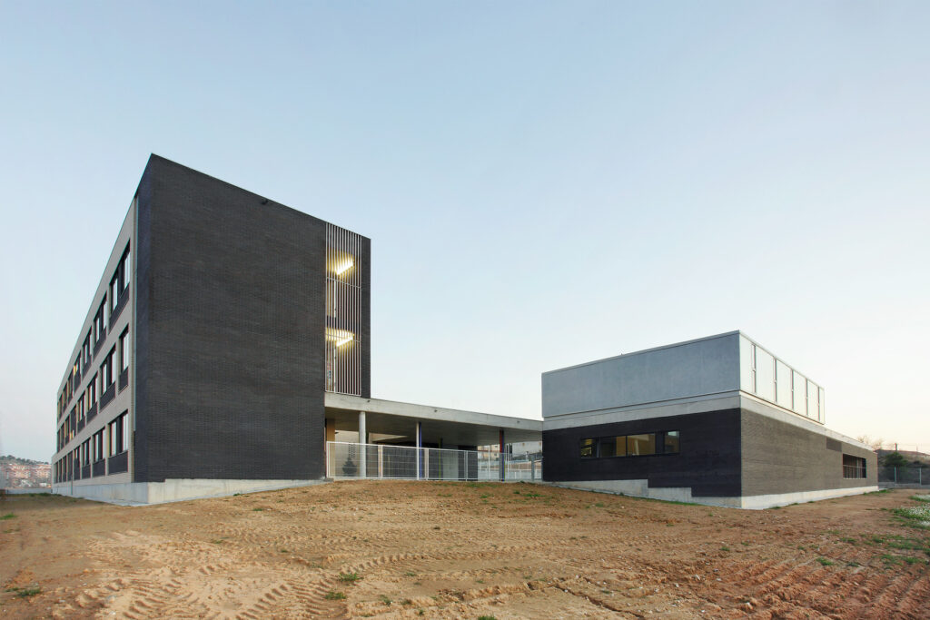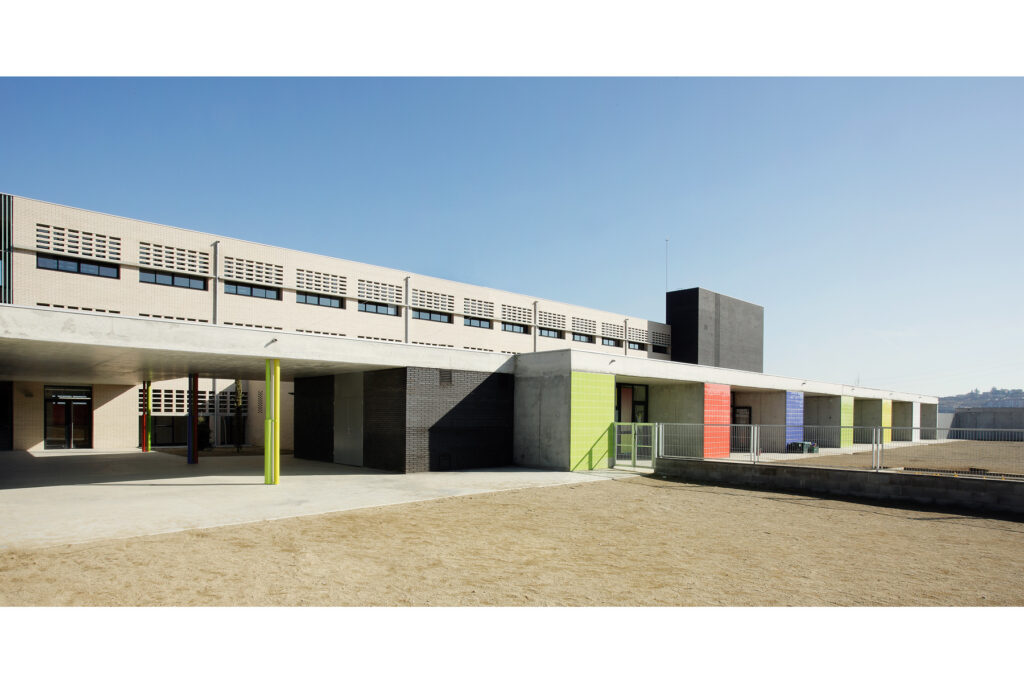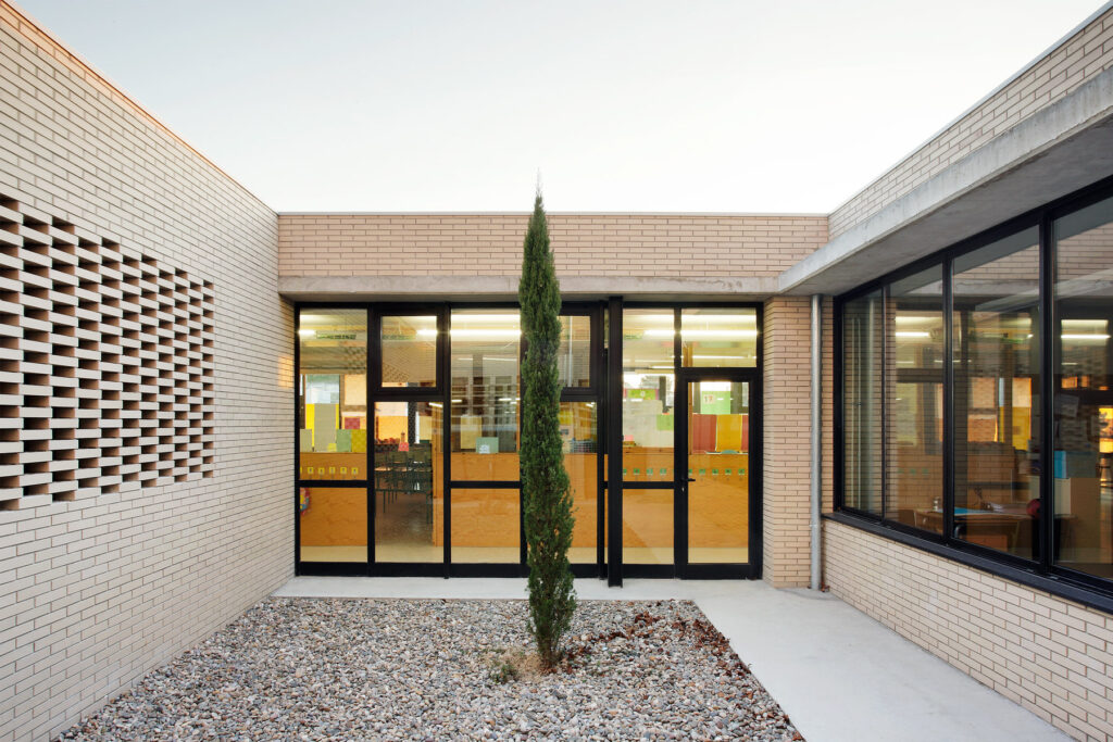 Quant a la formalització de les façanes, hi ha un treball que s’estendrà a posteriors projectes escolars per, tot mantenint la finestra horitzontal, trobar altres lectures que surtin d’aquest estàndard. La utilització intencionada del maó ceràmic amb gelosies o amb dos colors permetrà establir altres suggeriments: a la façana nord es crea la il·lusió d’un gran forat jugant amb l’engany visual dels dos colors del maó, i a sud s’eviten les sempiternes lames amb una gelosia que ocupa la meitat superior de les finestres i que proporciona una protecció suficient als espais de recorregut.