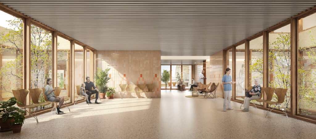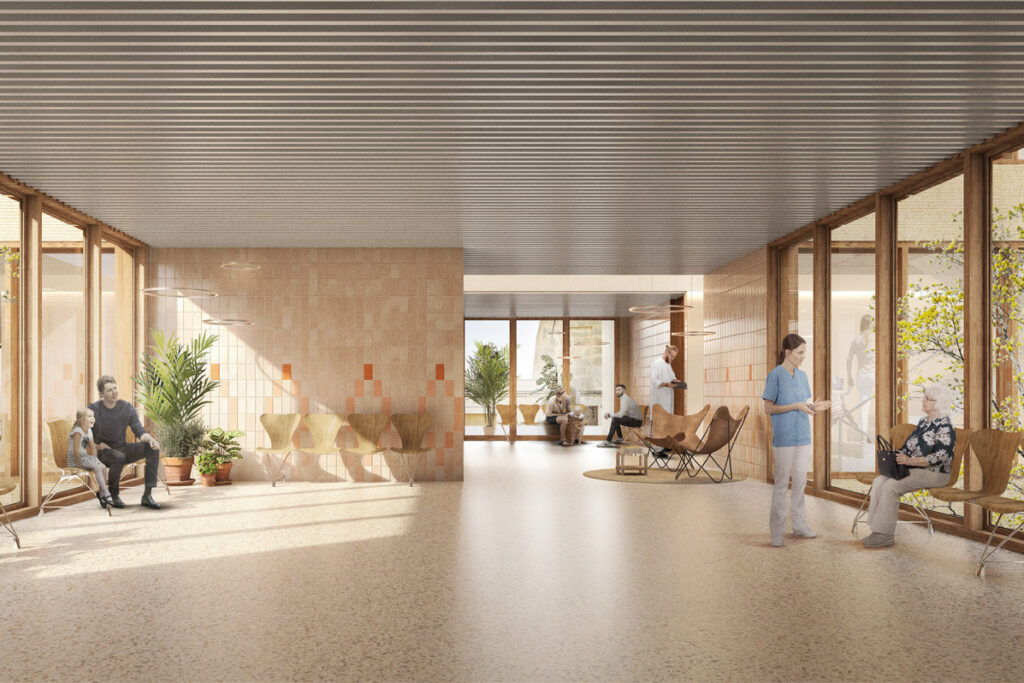 Un aspecte rellevant serà l’organització dels espais amb un sistema no jerarquitzat d’addició dels elements constitutius: la consulta l’espera i el pati. Aquest sistema d’agregació que recull, com s’ha dit, la parcel·lació de l’illa es connecta amb la definició d’un passadís ampli de circulació longitudinal, artèria principal, que conté en el seu recorregut els serveis i nuclis de comunicació vertical. La disposició d’esperes més petites en relació directa amb aquest eix i amb les terrasses que s’obren al carrer i esperes més grans i no sempre iguals separades de l’artèria principal i qualificades pels patis, dibuixen una organització pautada, diferenciada en àmbits acollidors qualificats per la seva dimensió amable, per la llum natural i la vegetació dels patis.