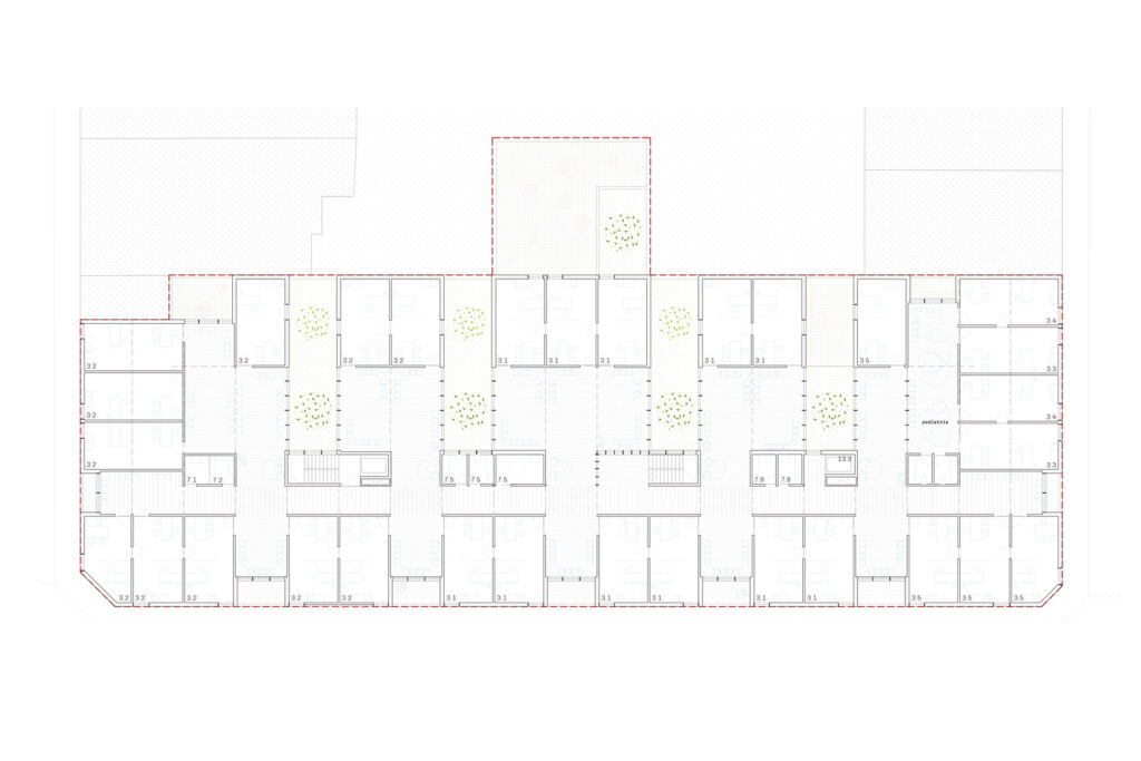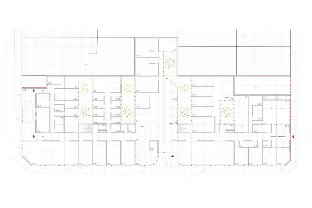 Per integrar un edifici de gran dimensió en aquest entorn de cassets de cos s’organitza el projecte modulant el solar a franges estretes i profundes recollint a la idiosincràsia de la parcel·lació de Llucmajor. Aquesta modulació permet, entre altres coses, l’aparició de diversos patis allargats que teixeixen l’espai interior amb una morfologia molt similar a la dels veïns, adequant la intervenció al nou solar al teixit urbà existent.