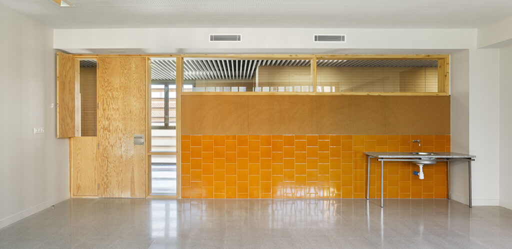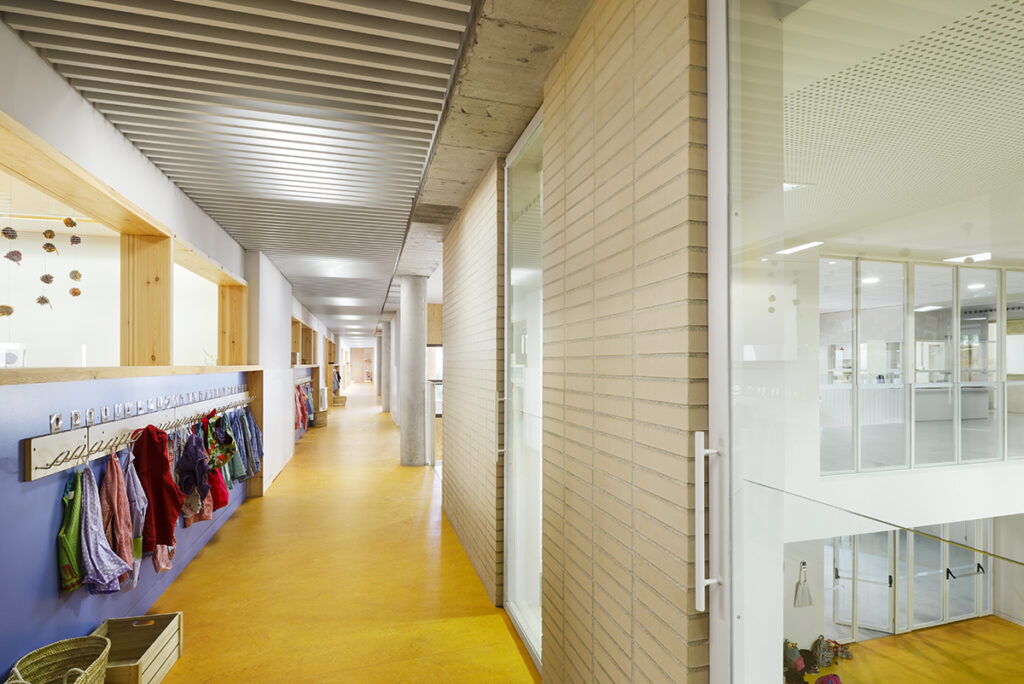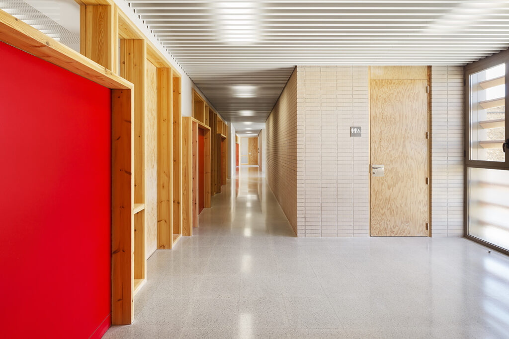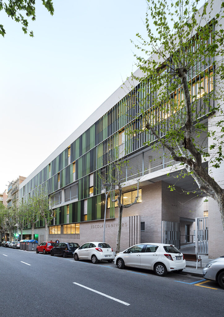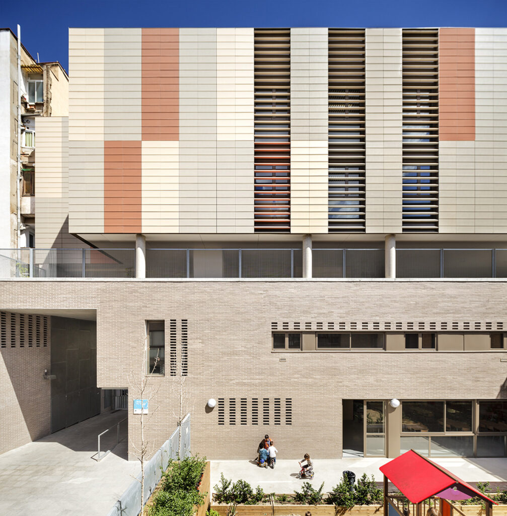 El tractament de l’envolvent serà de maó ceràmic en totes les façanes que no estan exposades, en canvi, les cares exposades de l’aulari de primària es resolen amb façana ventilada de ceràmica de gran format, protegint els forats amb peces de gelosia del mateix material.
