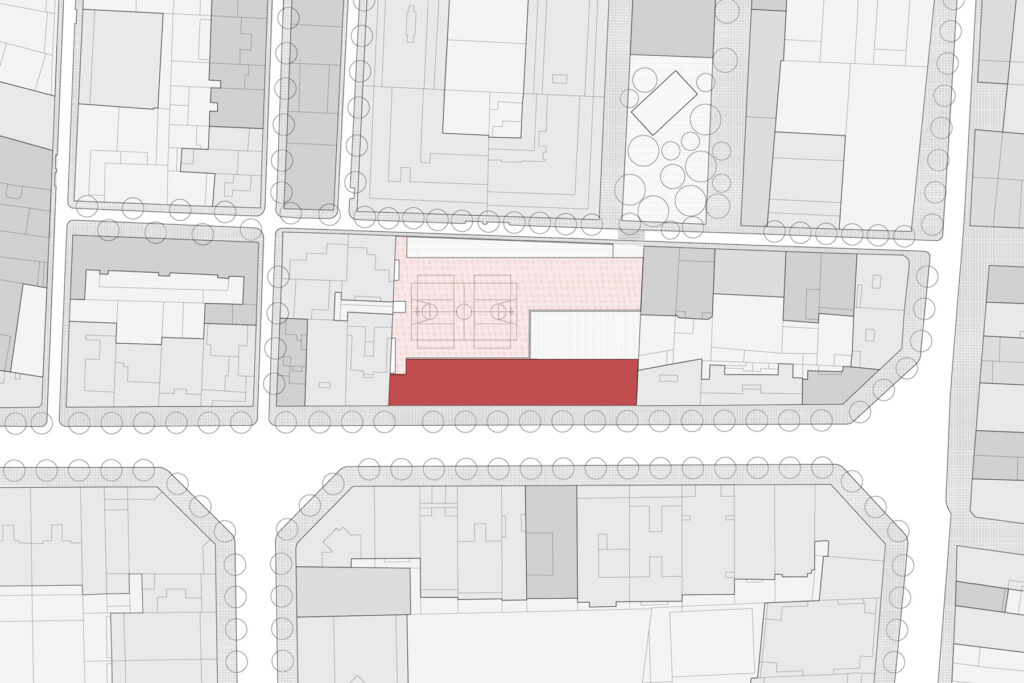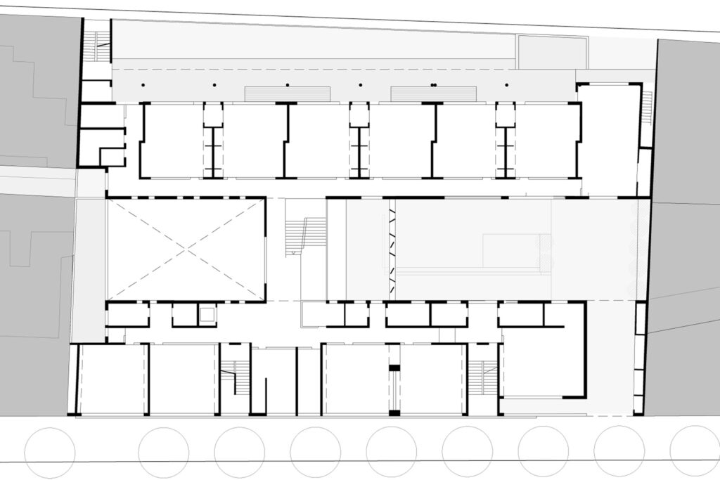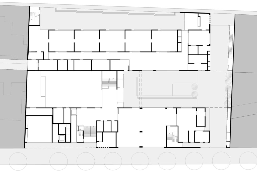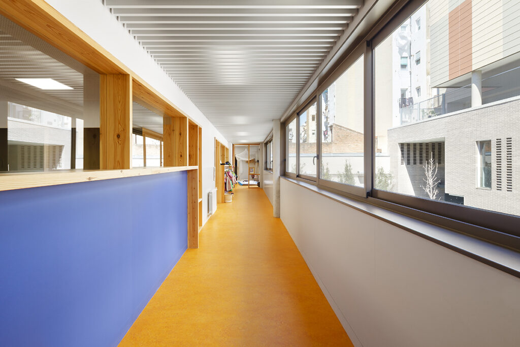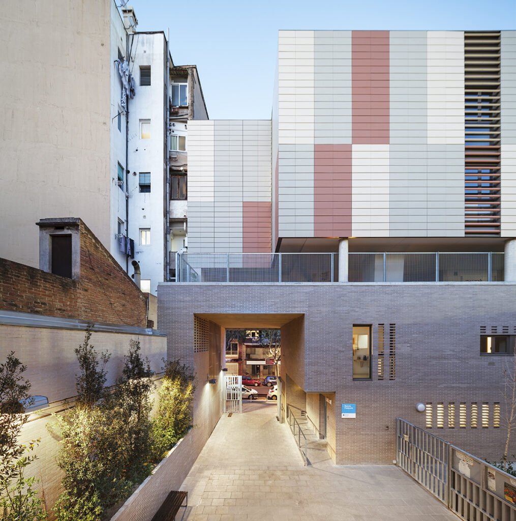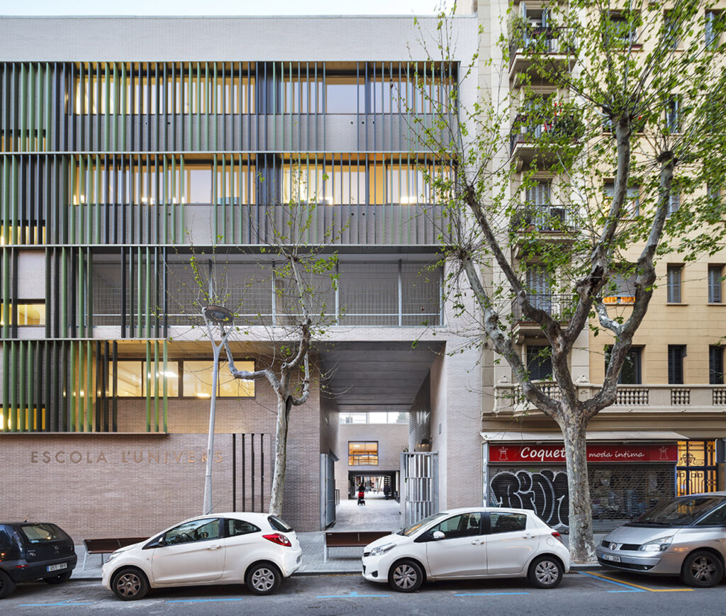 Els dos aspectes que caracteritzen l’encàrrec són el desenvolupament del programa escolar en altura i la inclusió dintre del solar d’un passatge de vianants per comunicar Gràcia i Eixample.