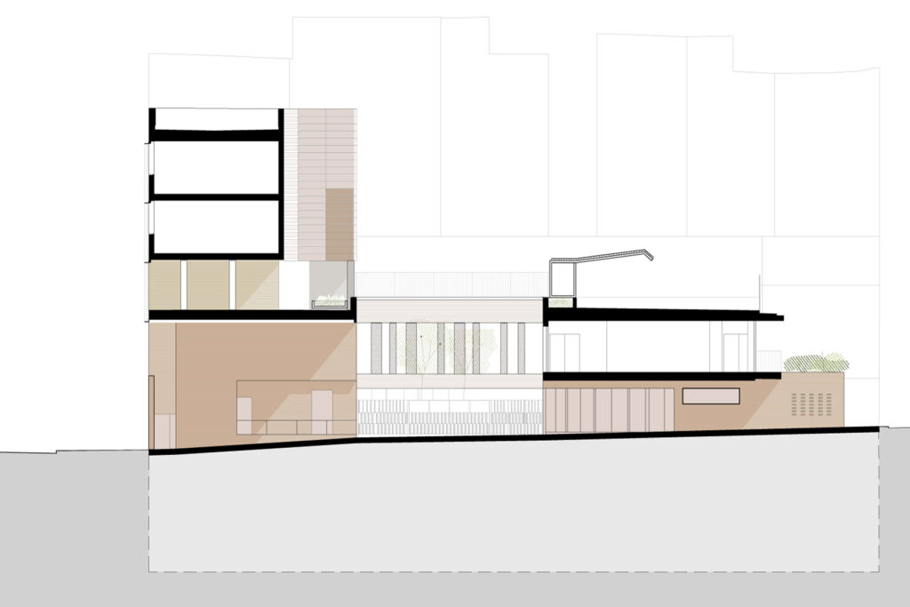 La secció pel passatge explica les decisions del projecte: un volum de dues plantes al costat de Gràcia (escola bressol en PB i infantil en P1) i un de cinc alçades al costat de l’eixample (espais comuns i primària). Al mig un pati central obert al passatge que acull, protegides respecte al trànsit rodat, les entrades al conjunt escolar i una part del pati d’infantil, al fons com a continuació del pati la sala gran del gimnàs.