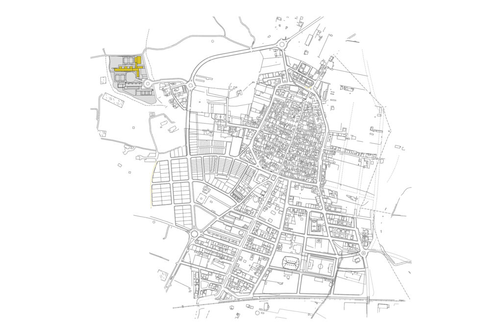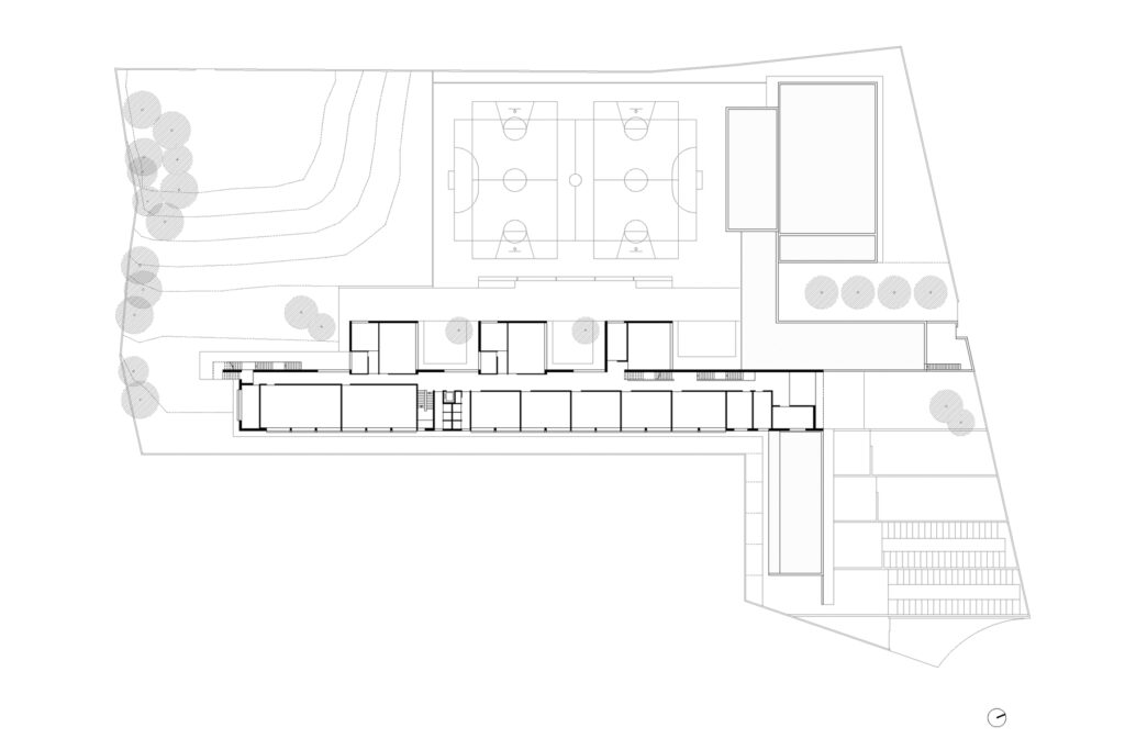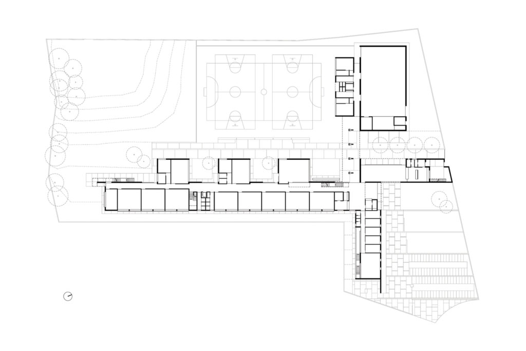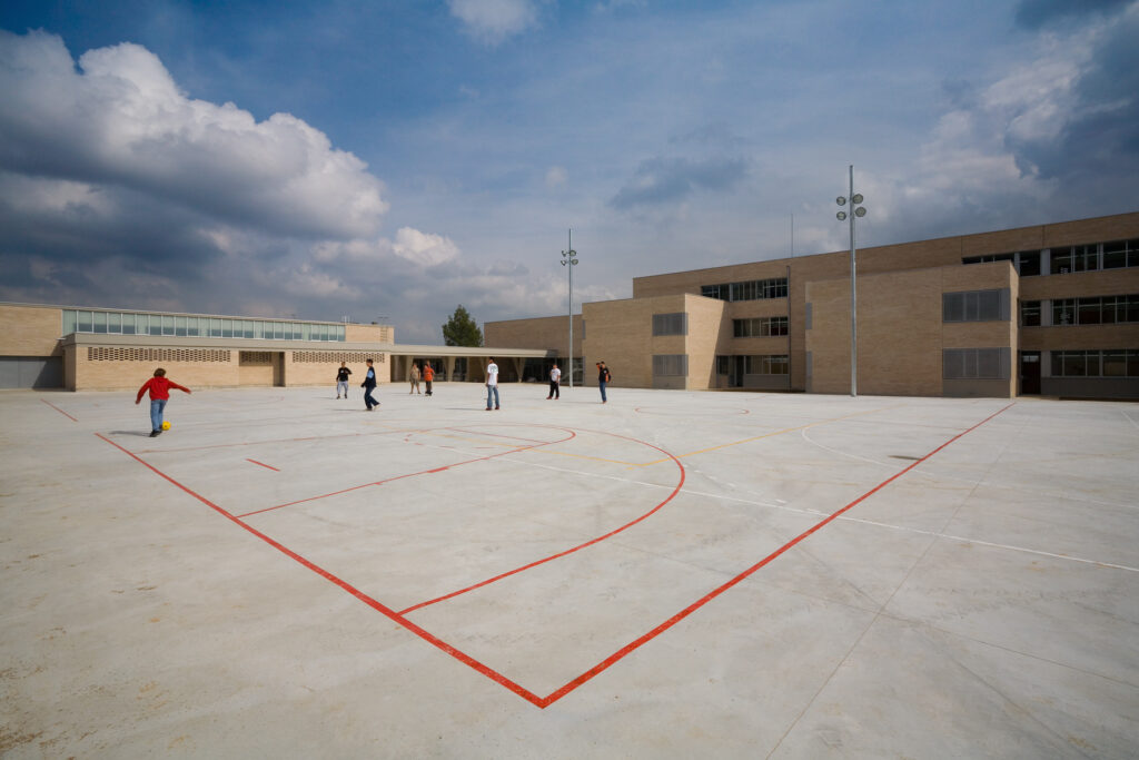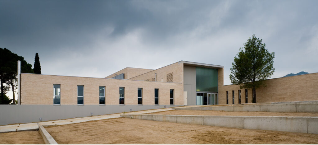 El solar és part d’una cessió d’equipaments que es troba al final d’un carrer acabat en cul de sac. Un solar rectangular amb un apèndix per arribar al carrer. La resposta a aquesta situació separada del viari serà fer present l’edifici des del carrer conformant, amb les façanes de l’administració i menjador, un gran atri fora de l’espai escolar: un espai d’arribada -entre plaça i jardí- que et dirigeix a la gran porta que franqueja el pas a l’interior del recinte escolar.