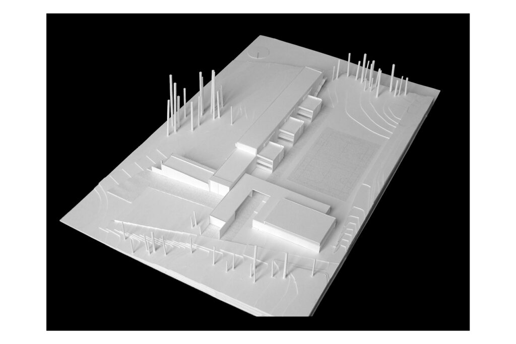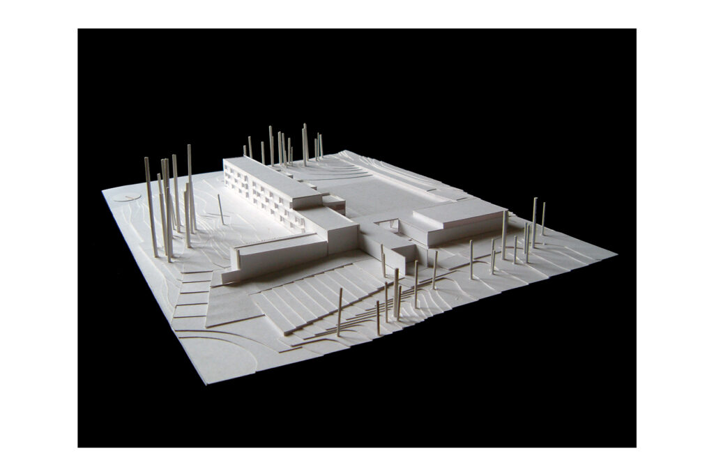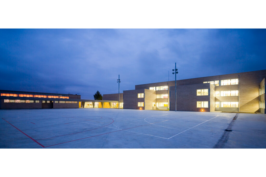 L’edifici s’ajusta i ancora als límits del solar estirant l’ala lectiva que farà façana al llarg de l’espai lliure de pati i pista. Es modula la gran presència que tindrà en el paisatge agrícola un edifici lineal de 90 m de longitud, amb el dibuix del seu perfil i amb els volums afegits al llarg de la façana de pati i pista. Aquests amb l’alternança del buit i ple –de la llum i l’ombra- adeqüen l’escala de l’edifici a l’entorn i a la vida del pati. A l’interior la situació d’aules, laboratoris, tallers i departaments avala la lògica de l’edifici lineal on la pauta dels volums proporciona riquesa als recorreguts dels passadissos.