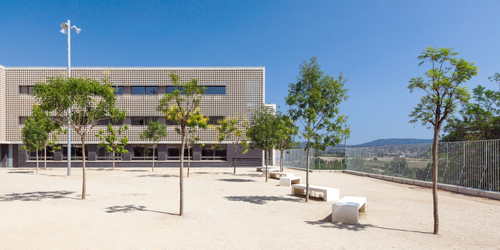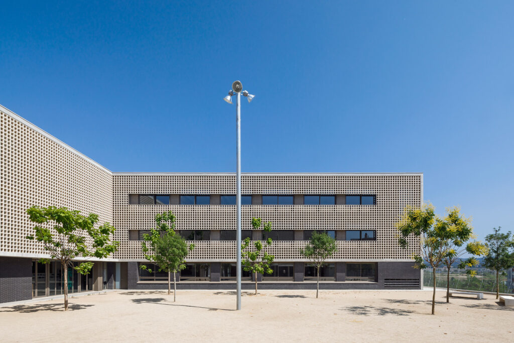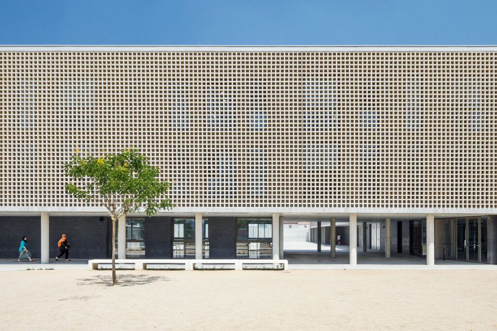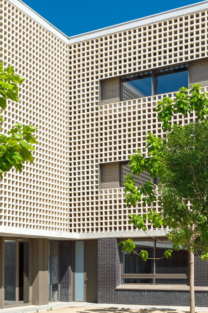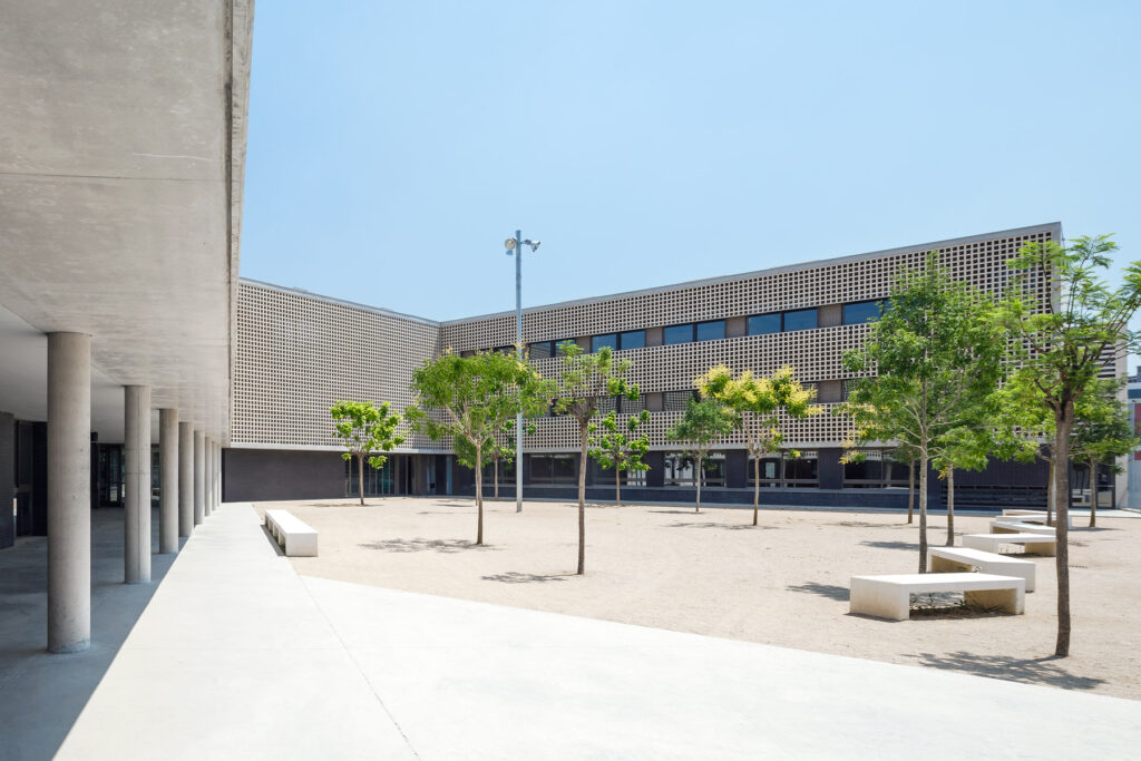 Un tractament continu amb gelosia ceràmica a les façanes del pati que dona accés a l’escola, actua com a teló de fons del recorregut peatonal dels alumnes al llarg del passatge Marconi.
