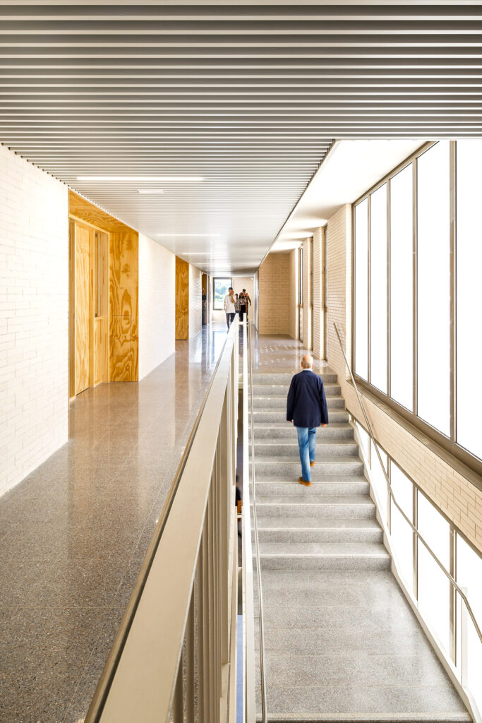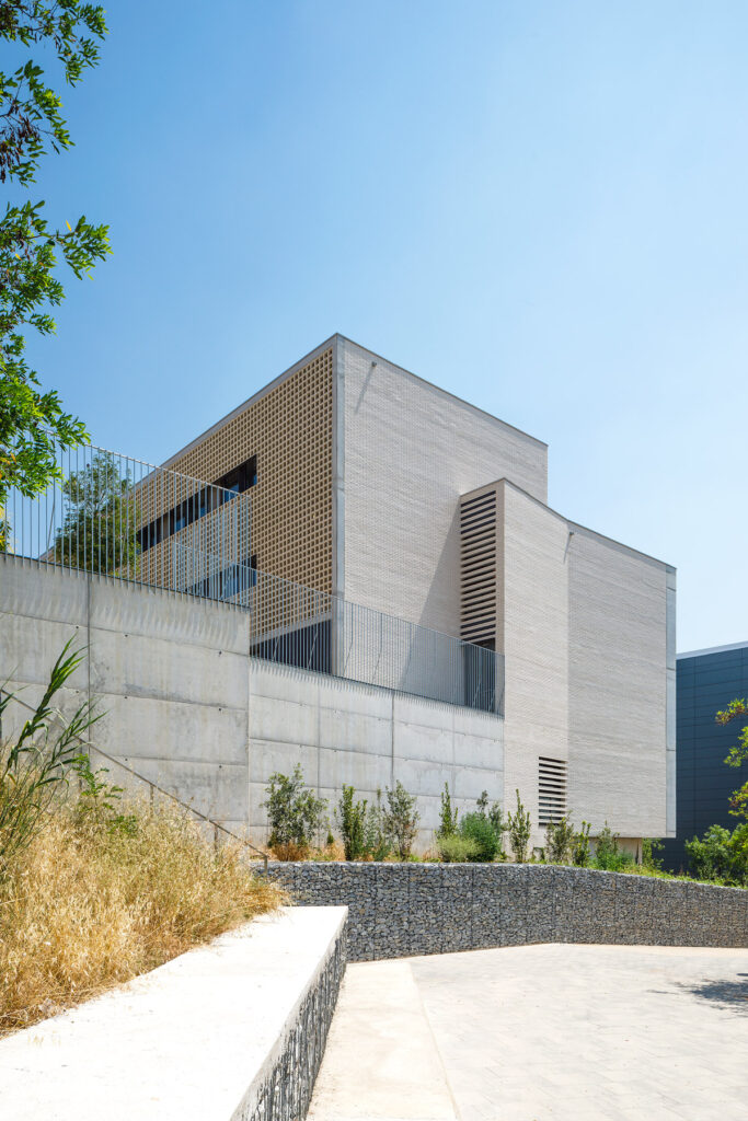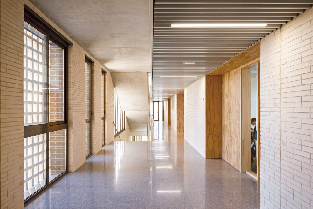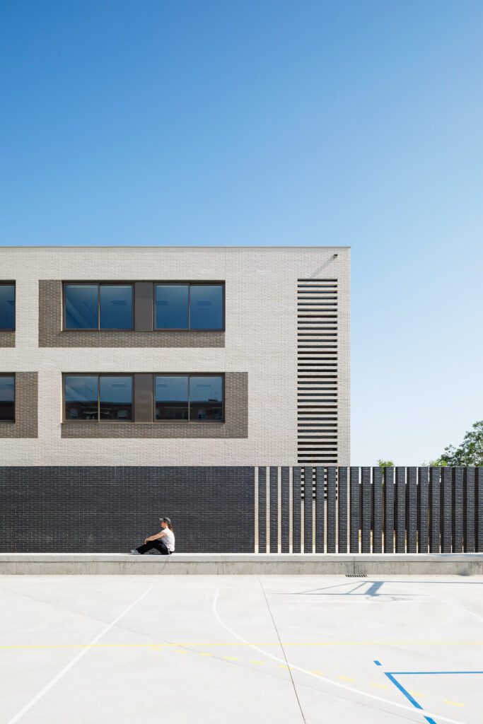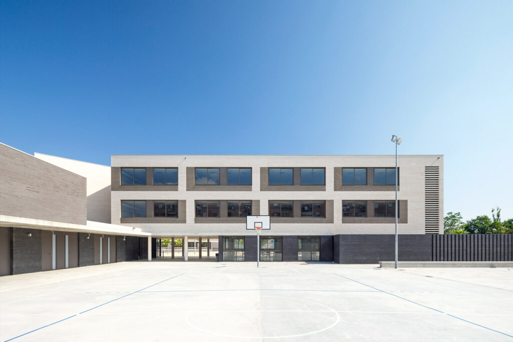 Un tractament continu amb gelosia ceràmica a les façanes del pati que dona accés a l’escola, actua com a teló de fons del recorregut peatonal dels alumnes al llarg del passatge Marconi.