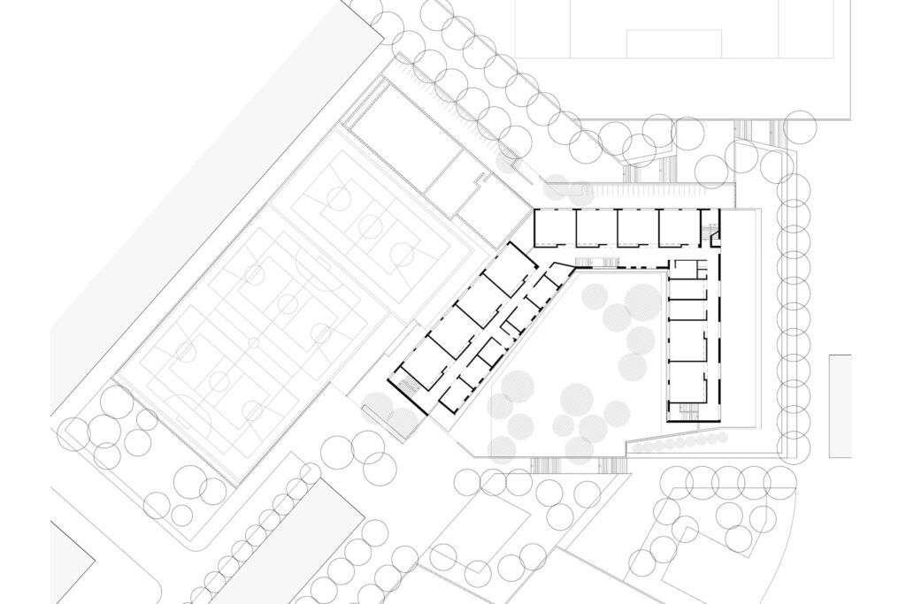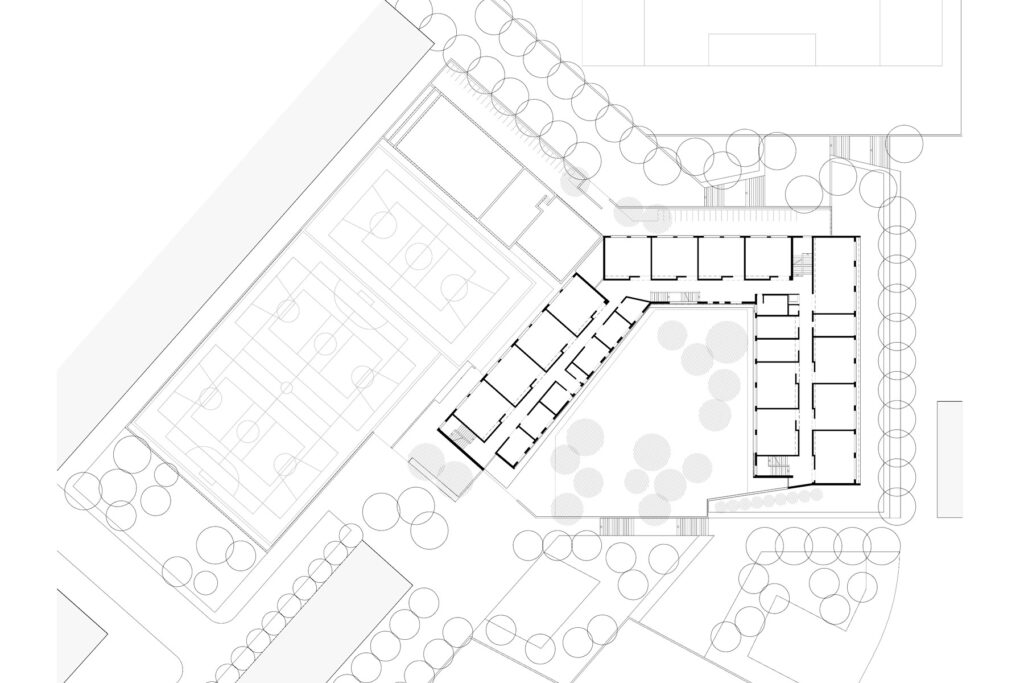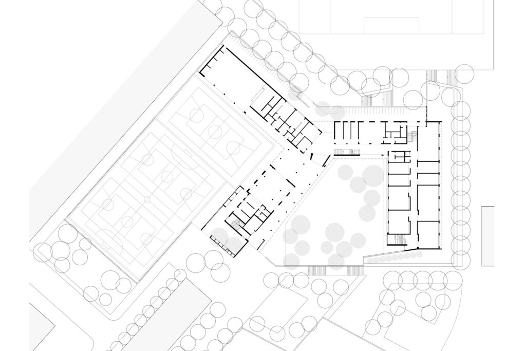 La situació inicial del lloc: preexistència dels mòduls prefabricats amb activitat docent, el desnivell del solar de fins a 7m i una urbanització del perímetre amb limitació de possibles accessos al centre escolar, determina i fixa el resultat de la proposta.
